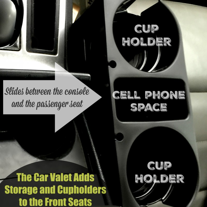 This Car Valet is available at Walmart and Bed Bath and Beyond and has two cupholders and a middle storage space that is perfect for my cell phone. It simply slides into that gap between the console and the passenger seat – up snug with the seat belt connection. Now I can at least store 4 beverages easily and that is a huge leap above what I was dealing with. Also, with that slid into the gap, other things such as wrappers, straws, money etc… cannot slide into the gap (black hole). I have found that it is a little inconvenient if an adult sized person is in the front passenger seat so it works best when the kids are in the back seat and no one is in the passenger seat.