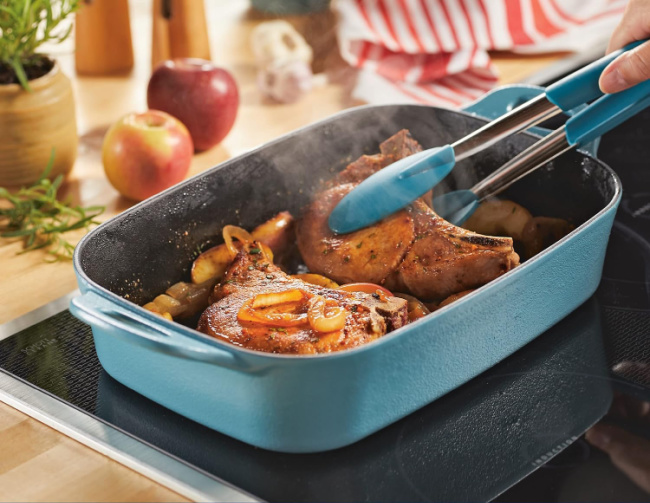 1 Lucky winner will win a Rachel Ray NITRO Cast Iron 9 X 13″ Roasting Pan In Either Agave Blue or Red! RV $70!
